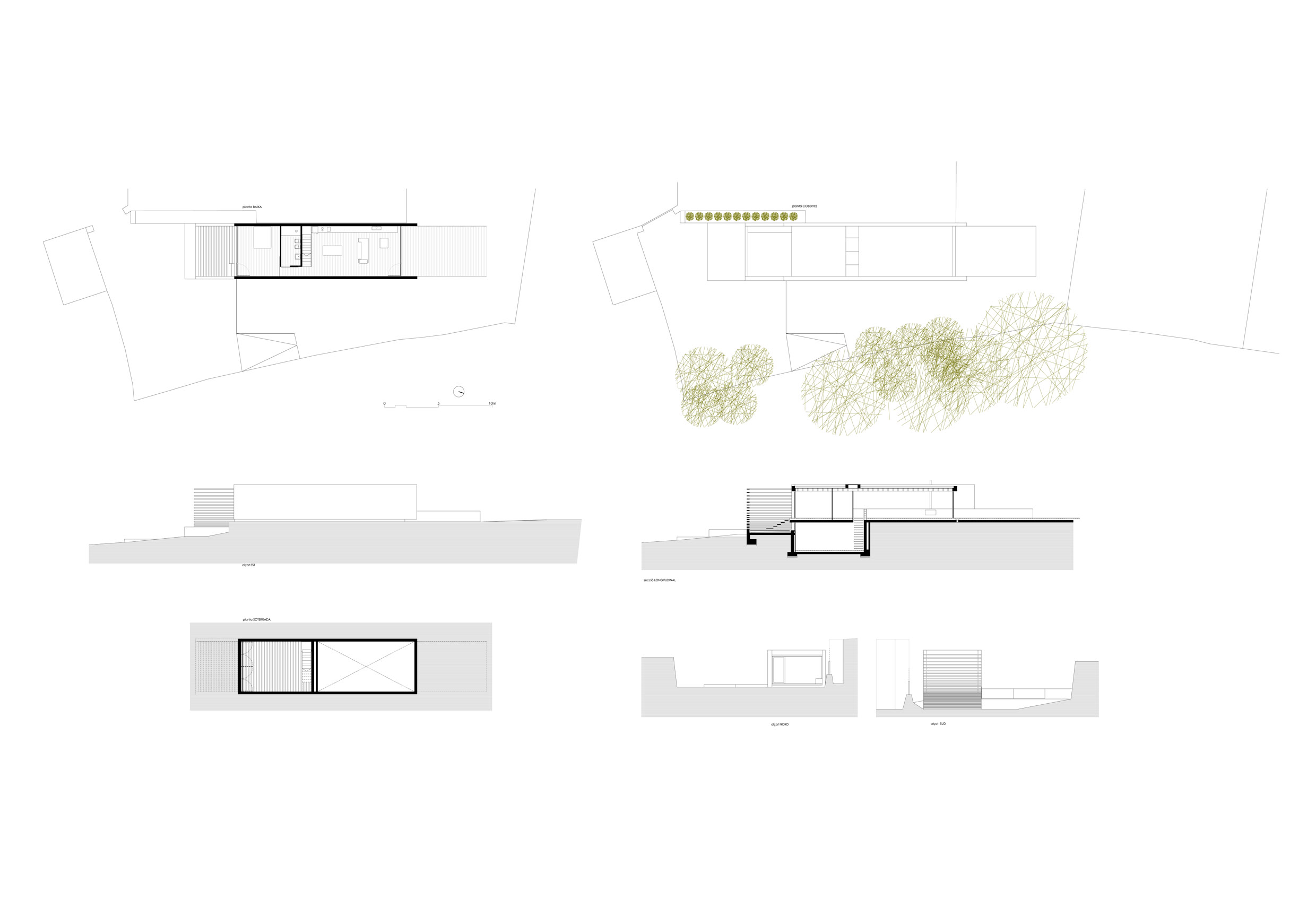 Una caja alargada, medio cerrada y tendida, que descansa entre bancales y viejas encinas, pero de cara al paisaje que la rodea y abierta a las vistas sobre el pinar y el encinar cercanos.